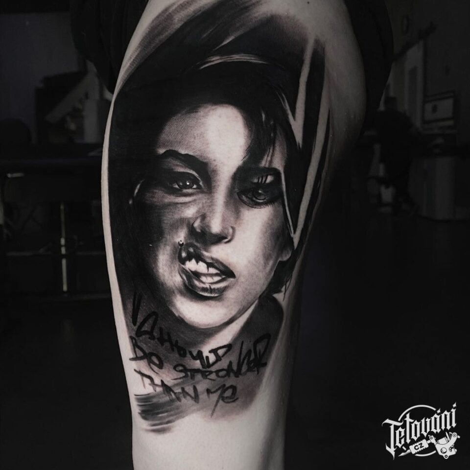 Tetování osobnosti, portrét Amy Winehouse na boku stehna