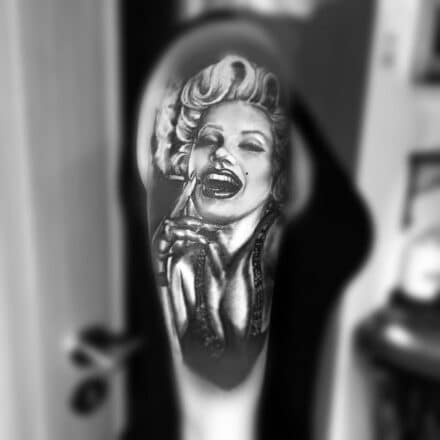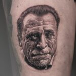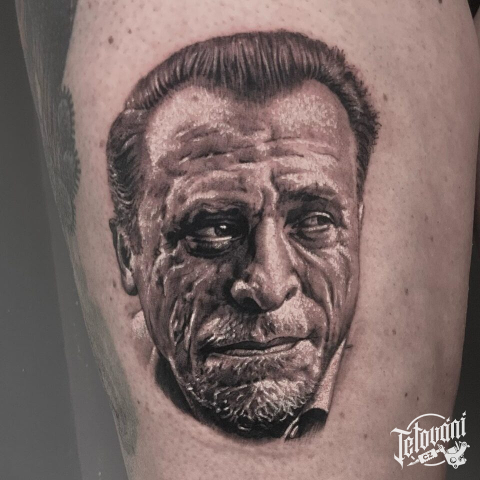 Tetování osobnosti, portrét, Charles Bukowski na stehně
