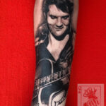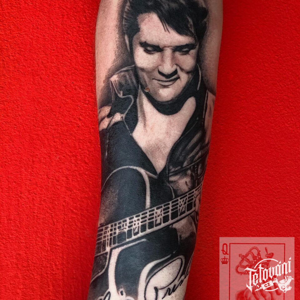 Tetování osobnosti, portrét, Elvis Presley s kytarou na předloktí