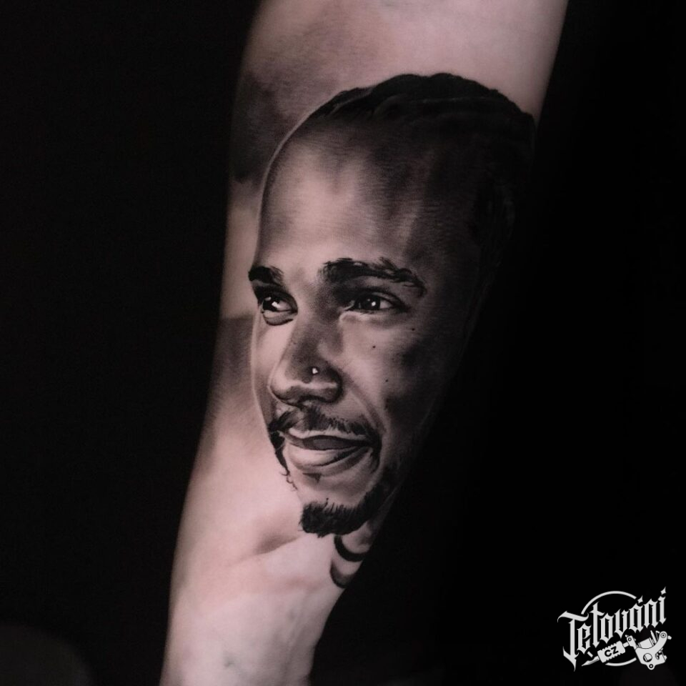 Tetování osobnosti, portrét Lewise Hamiltona na předloktí