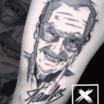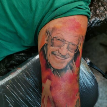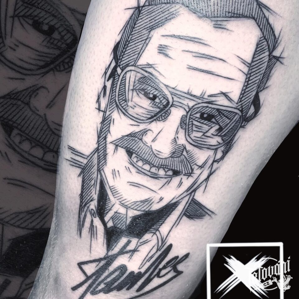 Tetování osobnosti, portrét, Marvel, Stan Lee na stehně