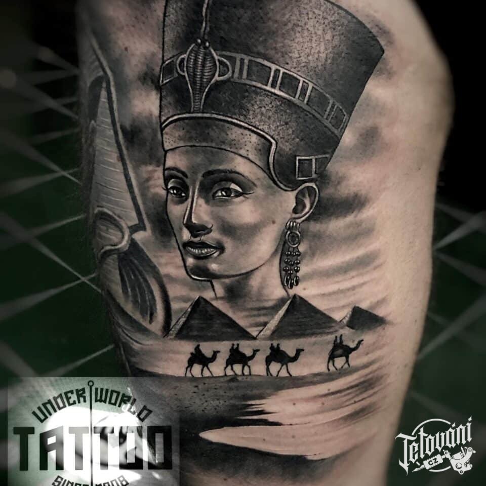Tetování osobnosti, portrét Nefertiti na stehně