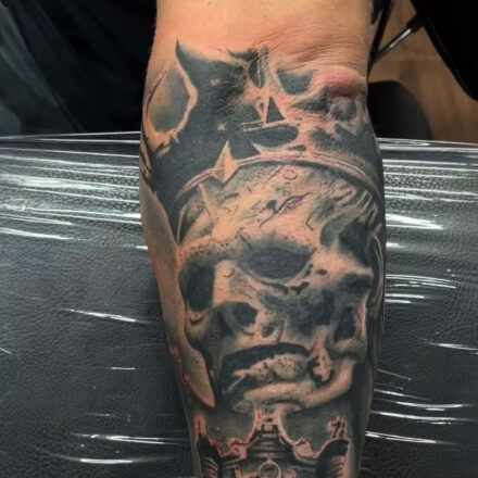 Tetování osobnosti, portrét s korunou a nápisy na rameni
