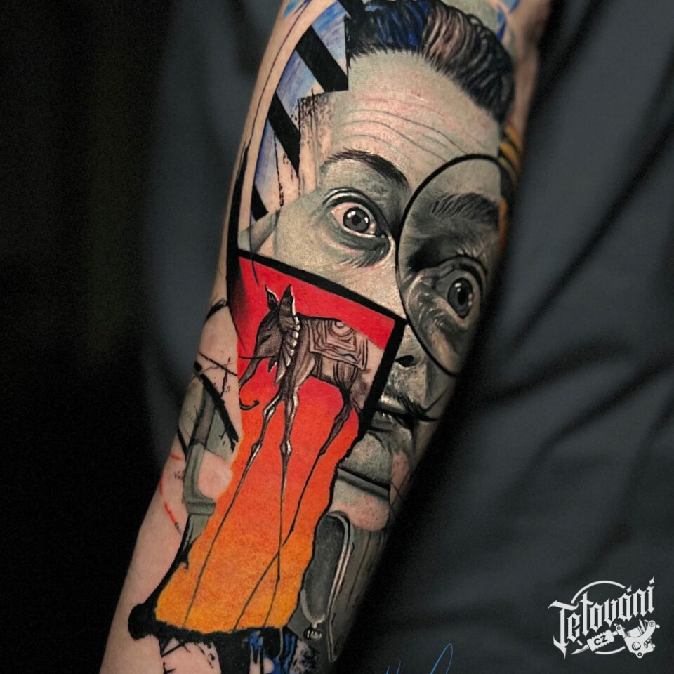 Tetování osobnosti, portrét, Salvador Dalí a slon na předloktí