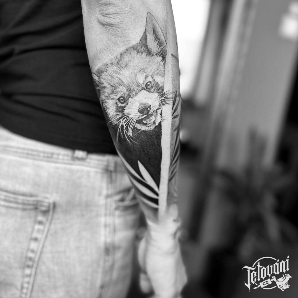 Tetování panda červená na předloktí