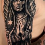 Tetování Panny Marie na pul s lebkou, symbol smrti na rameno