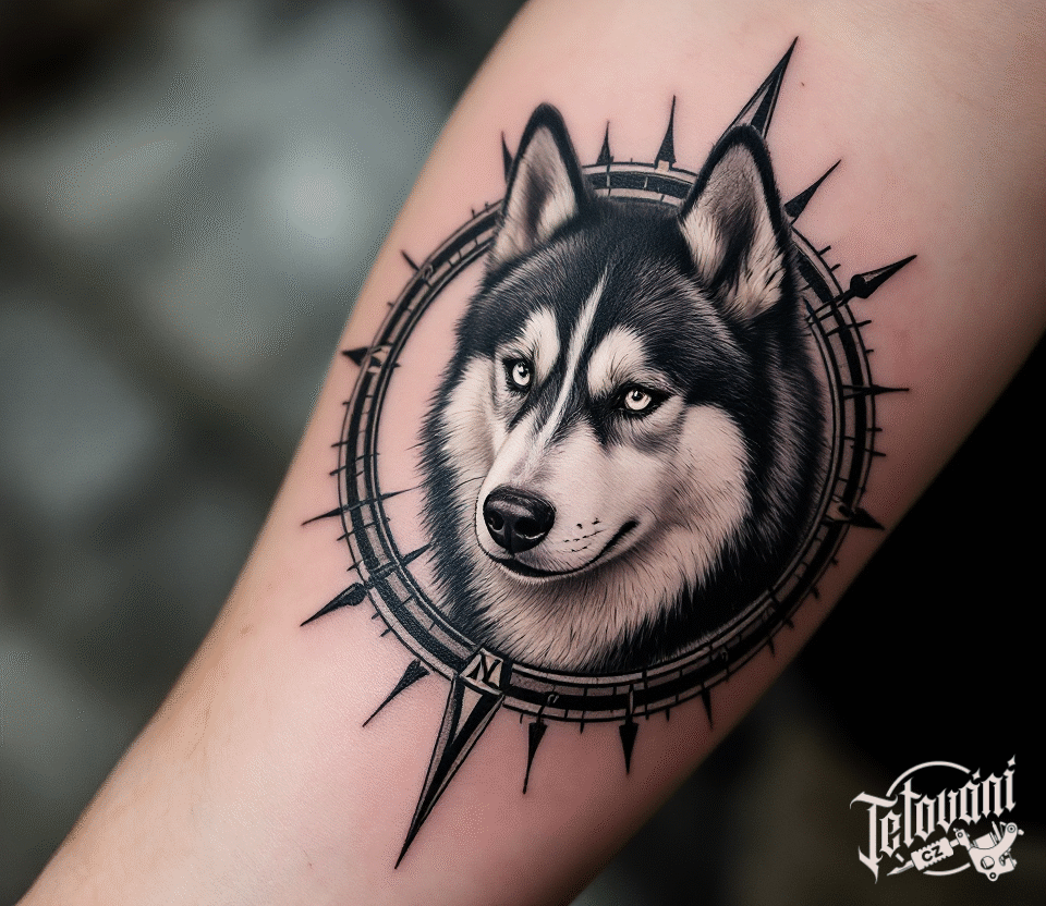 Tetování pes husky s kompasem na předloktí