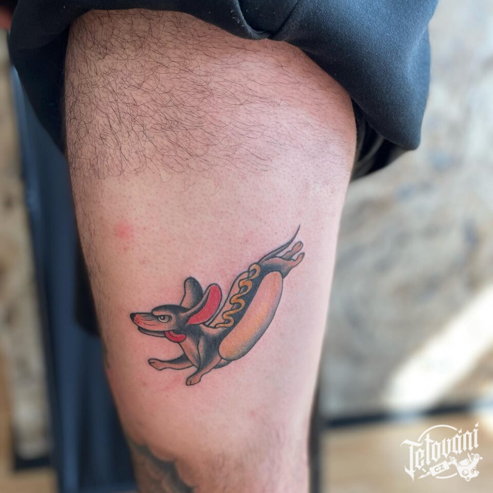 Tetování pes, znaky a symboly, hotdog na stehnu