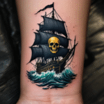 Tetování pirátská loď s lebkou na předloktí