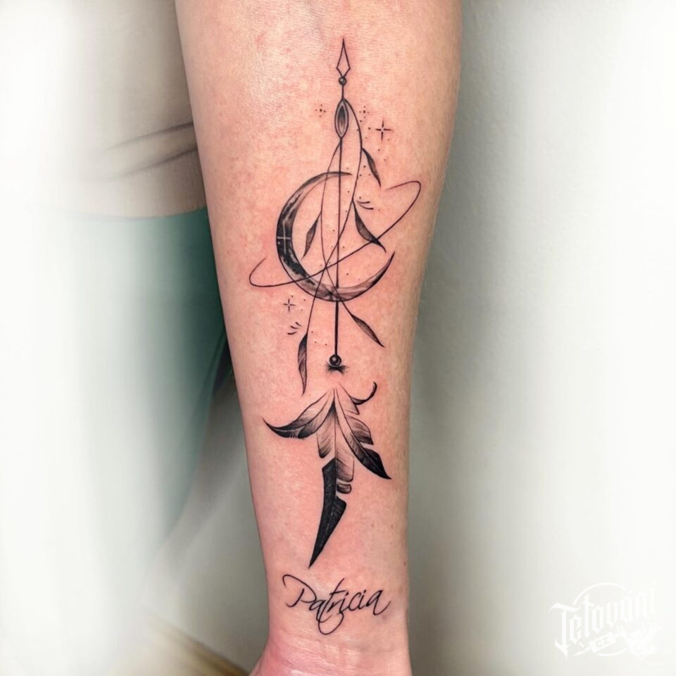 Tetování pírka, měsíc, jméno na předloktí