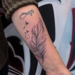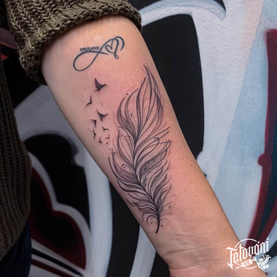 Tetování pírko a ptáci na předloktí