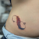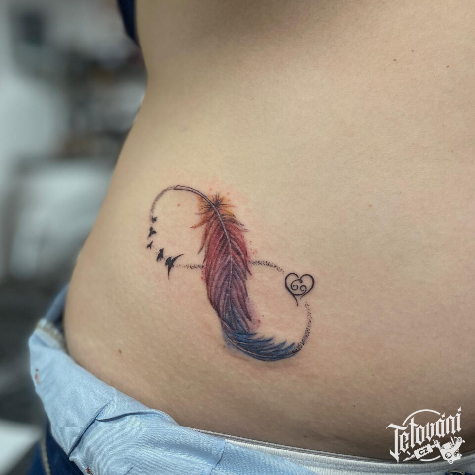 Tetování pírko, nekonečno, ležatá osmička na břichu