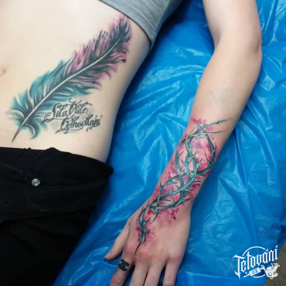 Tetování pírko s nápisem na břicho a znaky a symboly na předloktí