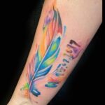 Tetování pírko s nápisem na předloktí