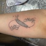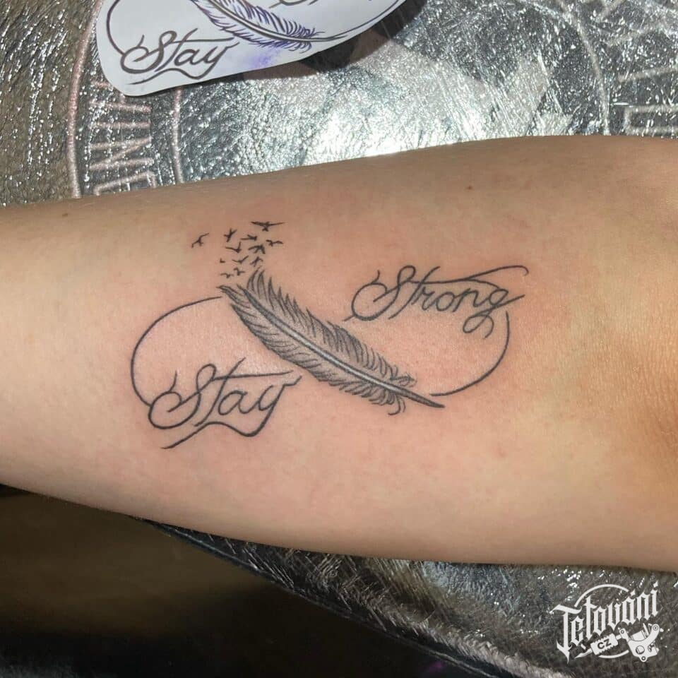 Tetování pírko s nápisem na předloktí