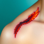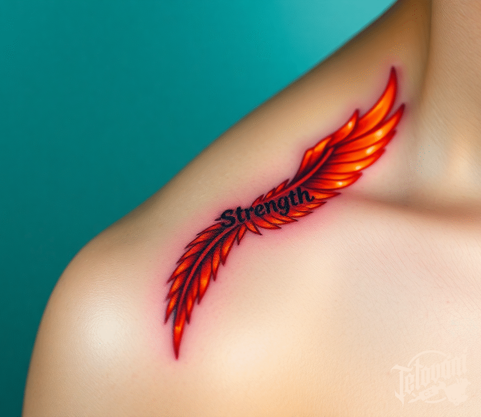 Tetování pírko s nápisem Strength na klíční kosti
