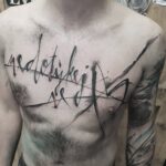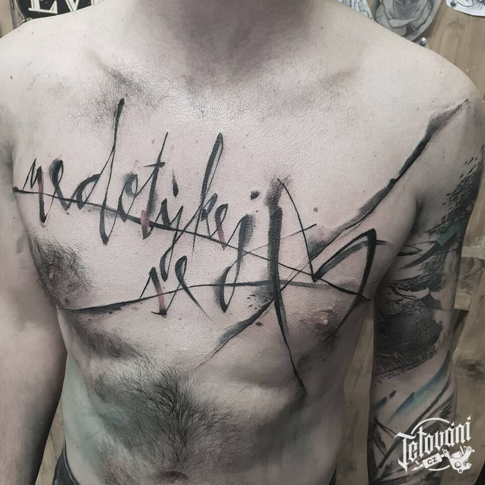Tetování písmena, nápis, čáry na hrudi