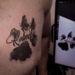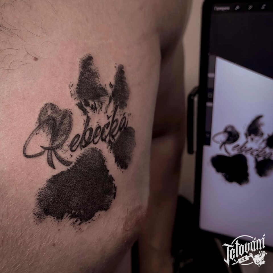 Tetování písmena, nápis, jméno s tlapkou na prsu