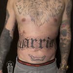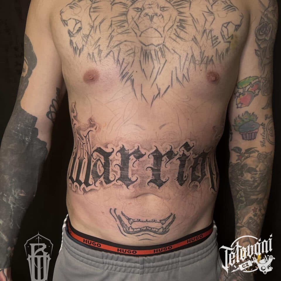 Tetování písmena, nápis na břichu