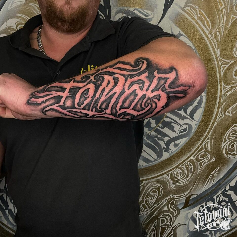 Tetování písmena, nápis na předloktí