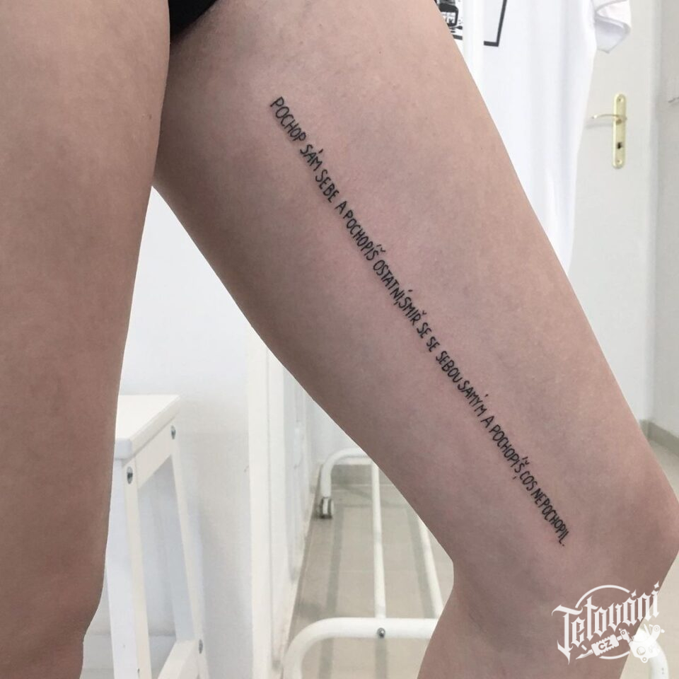 Tetování písmena, nápis na stehně