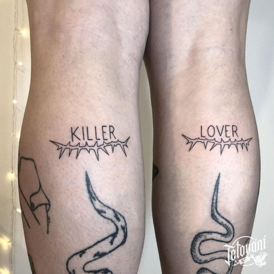 Tetování písmena, nápis, ostnatý drát na lýtku