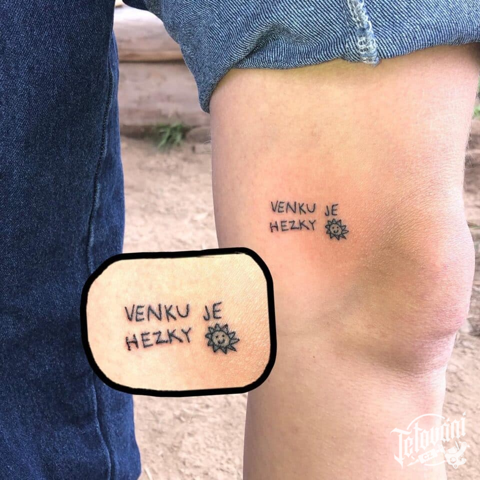 Tetování písmena, nápis se Sluníčkem na koleni