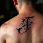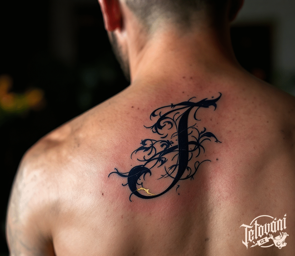 Tetování písmeno J, nápis na záda