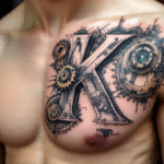 Tetování písmeno K a ozubené kola na prso