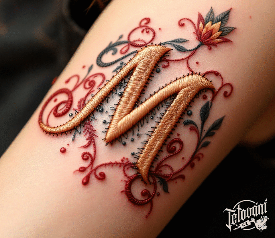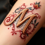 Tetování písmeno M, nápis s ornamenty na rameno