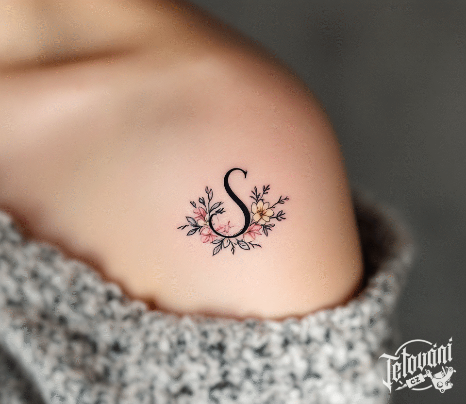 Tetování písmeno S, nápisy, květiny na rameno