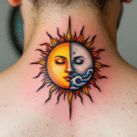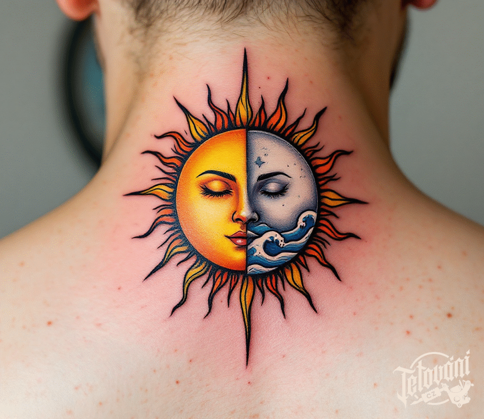 Tetování planety, Slunce a Měsíc, karma na krku