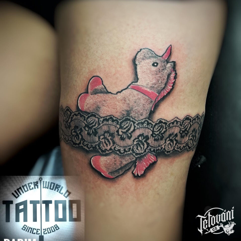 Tetování podvazek a jednorožec na stehno