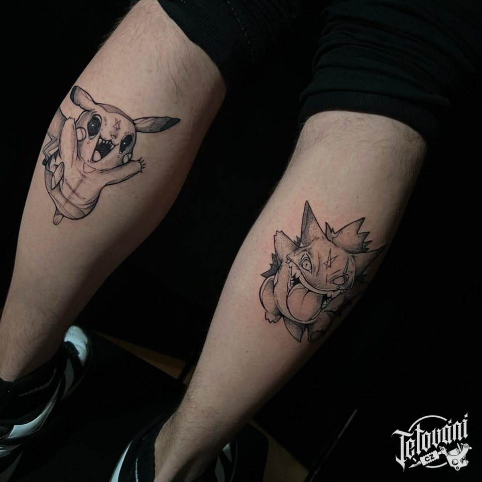 Tetování pokémoni z filmů a pohádek anime na lýtku