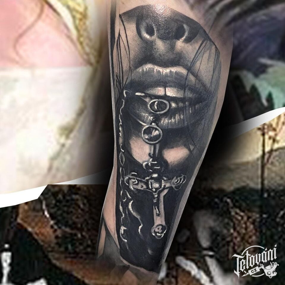 Tetování portrét a kříž na předloktí