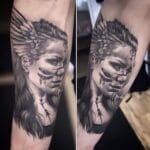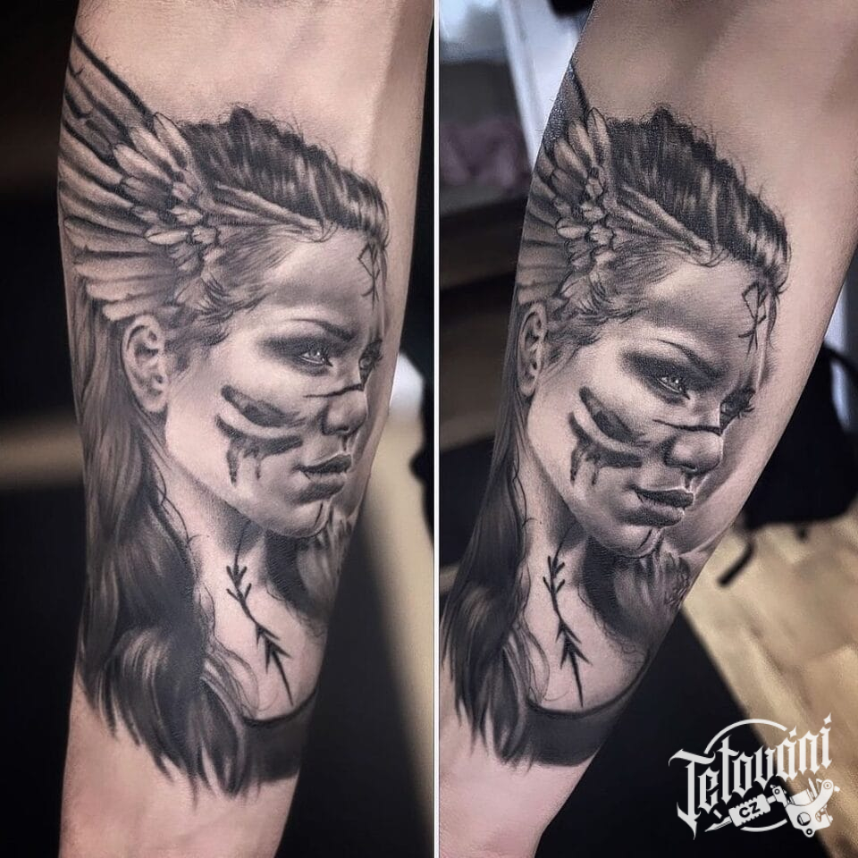 Tetování portrét a mýtická bytost Valkýra na předloktí