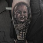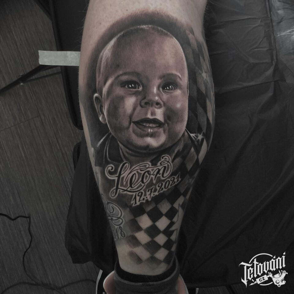 Tetování portrét a nápisy, dítě, jméno, datum na lýtku