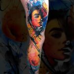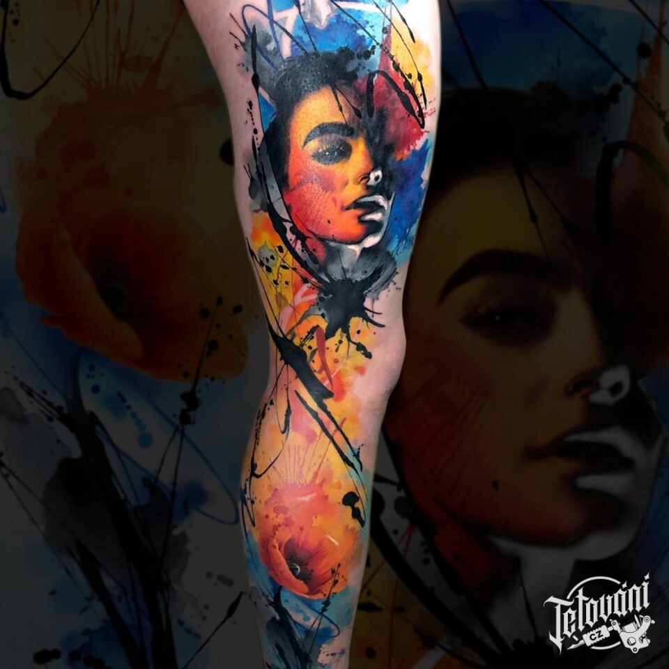Tetování portrét a vlčí mák na noze