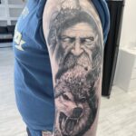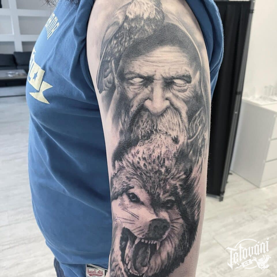 Tetování portrét a zvířata, vlk na rameni