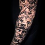 Tetování portrét a zvíře, lev, ornamenty na rukáv