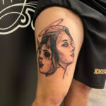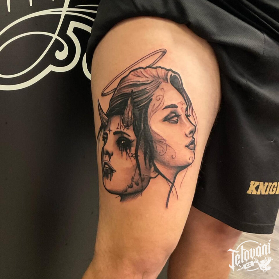 Tetování portrét anděl s ďáblem na stehně