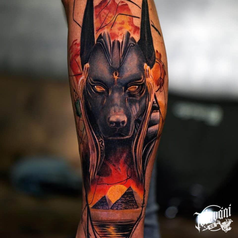 Tetování portrét Anubise, náboženství, slunce na lýtko
