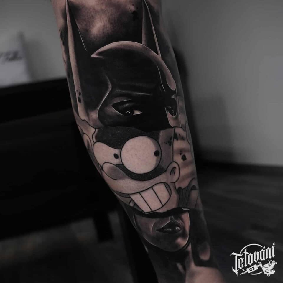 Tetování portrét Batmana a Barta Simpsona z filmů a pohádek na předloktí