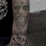 Tetování portrét bojovníka s runa symboly na předloktí a hřbet ruky