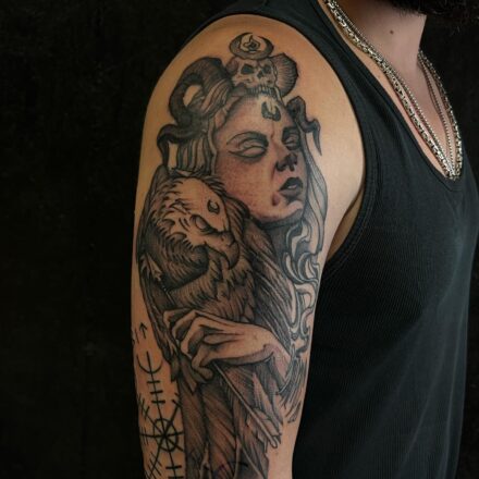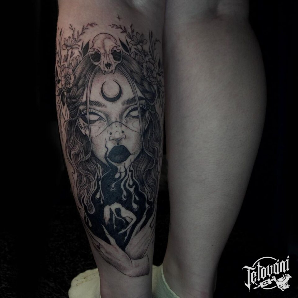 Tetování portrét čarodejnice, lebka, měsíc, ruce, květiny na stehně