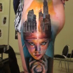Tetování portrét, cestování, planeta na stehně