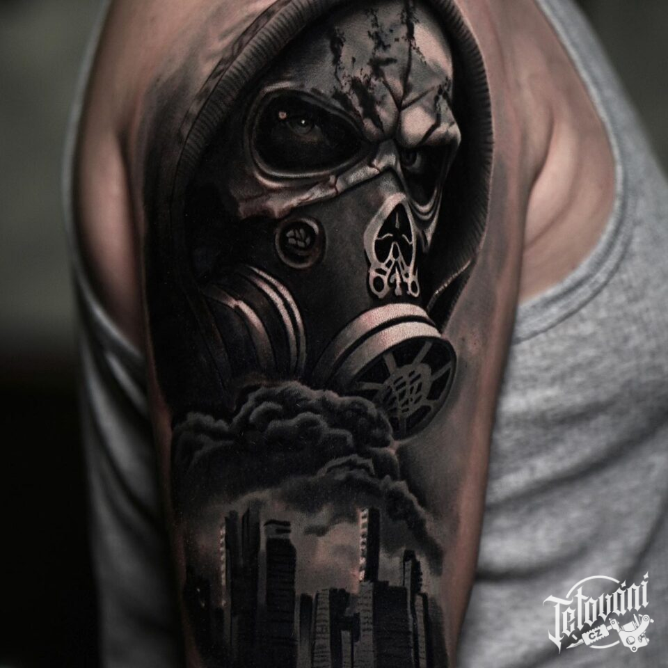 Tetování portrét člověka s plynovou maskou, symboly na rameno