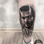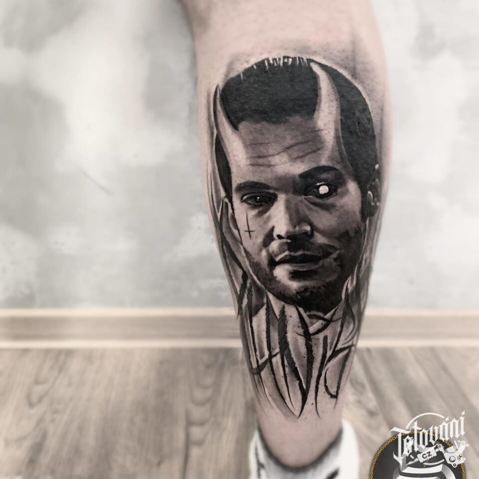 Tetování portrét, ďábel na lýtku