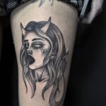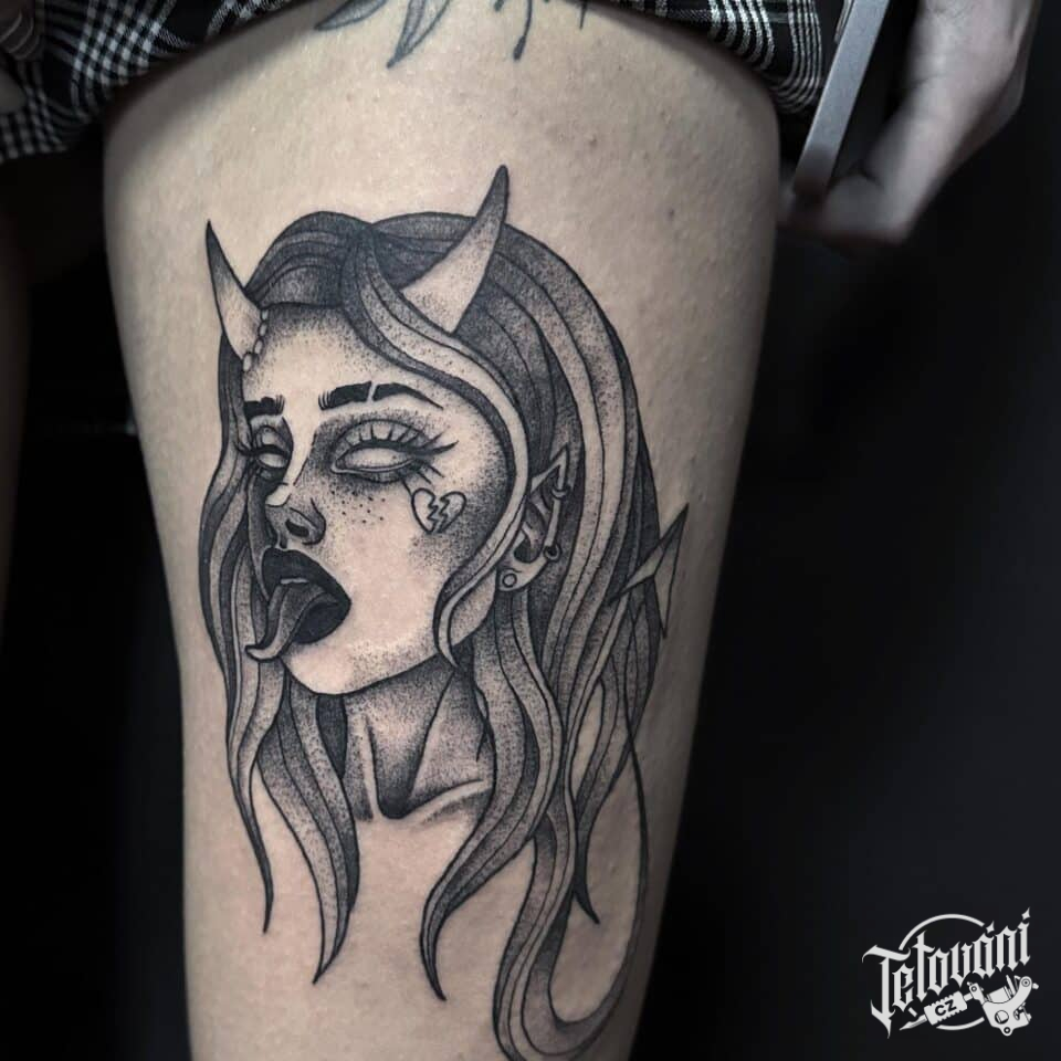 Tetování portrét ďáblice na stehně