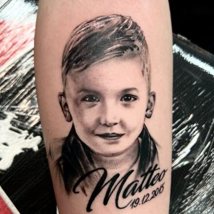 Tetování portrét dítě se jménem na rameno